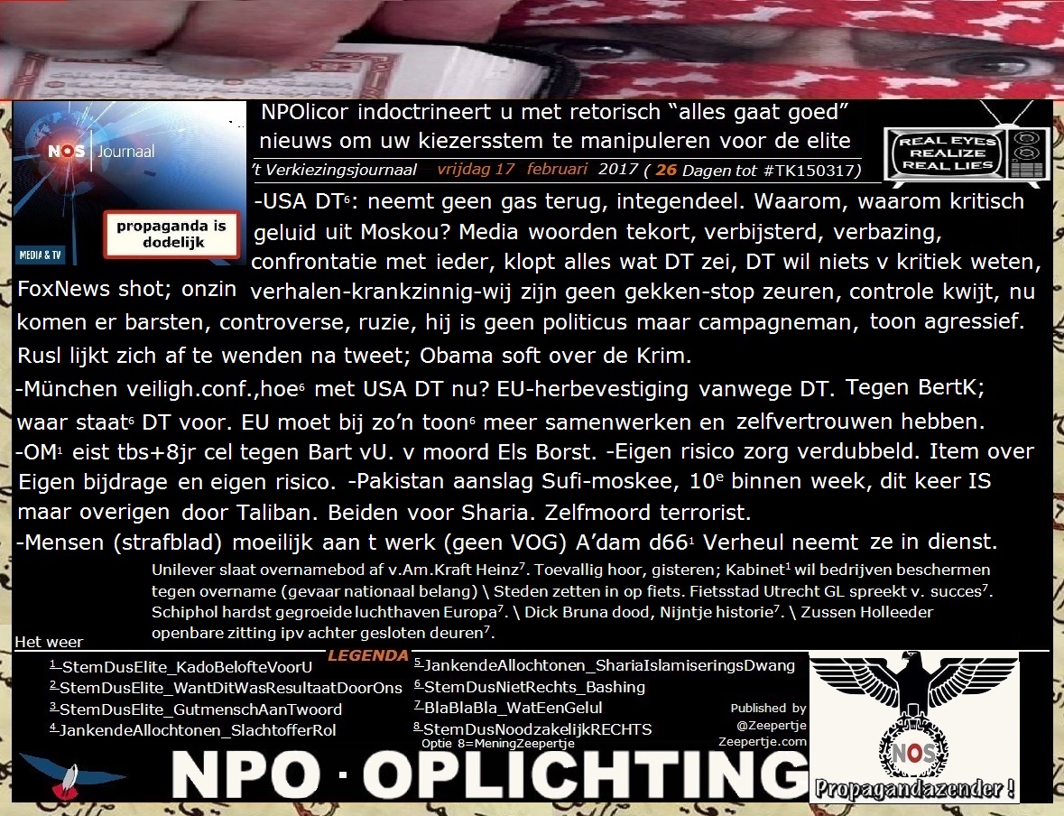 Terug naar de studio gooit Rob Trip nog even de tweet van Trump erin over de mogelijk softe aanpak van Rusland door Obama aangaande de Krim. Dit zou reden kunnen zijn voor het zich mogelijk afkeren van president Trump door Rusland. Wanneer na een volle 9 minuten de Trips, Wollaarsen en Zwarten hun zak geleegd hebben, de munitie op is en zij volledig bevredigd zijn, wordt overgeschakeld op Nijntje, wiens schepper Dick Bruna is overleden. Alle items, zoals deze, die in het licht van gekleurdheid of politiek geen waarde hebben staan onderaan samengevat onder de noemer BLABLABLA_WatEenGelul in categorie 7. Evenzo het volgende Unilever-item, schiphol, Holleeder etc… Het Openbaar Ministerie komt in hoger beroep met een zwaardere eis voor de moordenaar op Els Borst destijds want ja, een gang van zaken als bij Volkert van der Graaf is natuurlijk niet goed voor het vertrouwen in de politiek hè, zo vlak voor de verkiezingen.