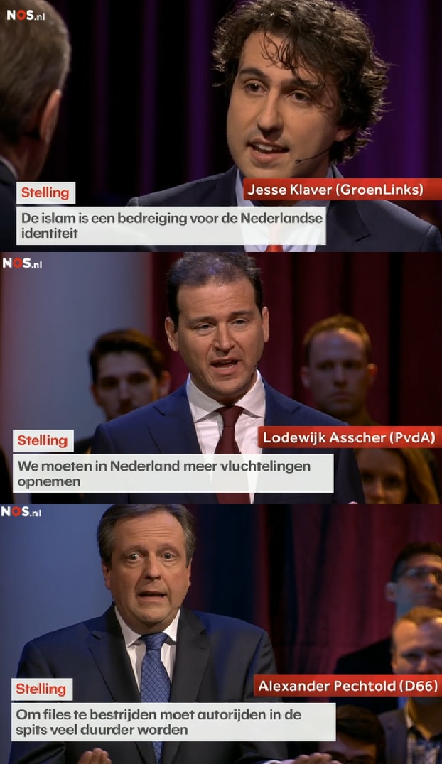 Zonder Wilders en Rutte waren er weinig harde confrontaties. De aanwezigen zochten de verbinding door overeenkomsten. Ook wilden sommige aanwezige partijleiders zich graag profileren als toekomstig premier. Klaver die ziet zijn voorkeurscoalitie hier voor zich maar Buma is het daar zeker niet mee eens.