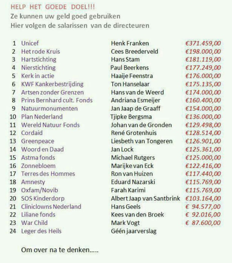 Een goedmens van Oxfam Novib wordt aan het woord gelaten over blabla enzo. Vervolgens toont NPOlicor wat beelden van de VN meneer die de ernst duidt om vervolgens weer terug te schakelen naar mevrouw Novib en voila, ineens komt ze volledig met bedelshirt in beeld zoals u op de foto-inzet hierboven kunt zien. Geeft u vooral, maar zoek eerst even in onderstaand tabelletje de oganisatie op…