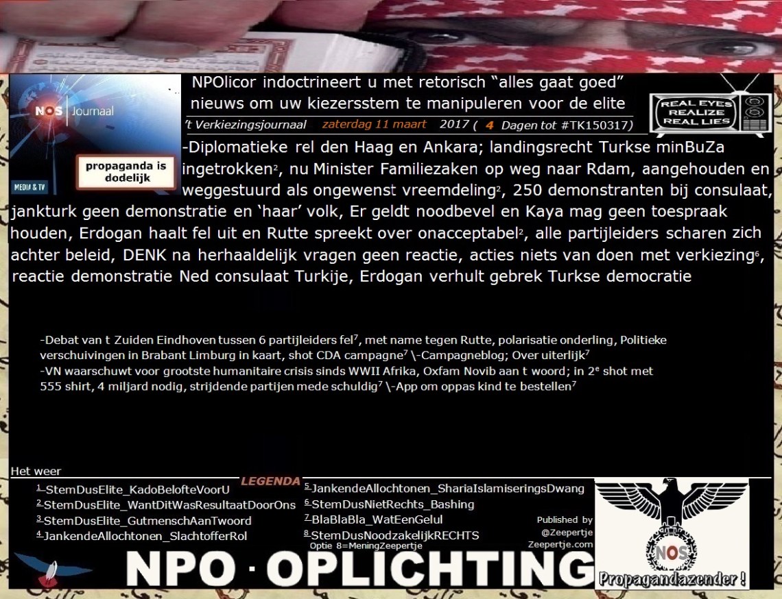 Het NPOlicor journaal wordt dit keer zwaar gedomineerd door de spanning tussen den Haag en Turkije die op scherp is komen te staan door het intrekken van het landingsrecht van het toestel met aan boord de Turkse minister van Buitenlandse Zaken Cavusoglu eerder vandaag door Rutte. Ik heb dit statement voor u toegevoegd zoals het op de pagina van de Minister President te vinden was op Facebook.
