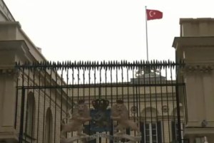 doorgebracht en uiteindelijk na protest toch maar afgedropen richting Duitsland. Aan de andere kant van de ambassade had zich een menigte Turken verzameld van een paar honderd man, bewapend met vlaggen. Nadat die Kaya vertrokken was werd de