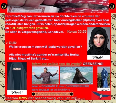 “( . . .) de dubbele Jodenster die de hoofddoek is en die niet alleen staat voor de racistische onderdrukking van de vrouw binnen de antisemitische islam, maar ook voor de vijandschap en minachting van het Übermenschen-geloof richting “ongelovigen”...