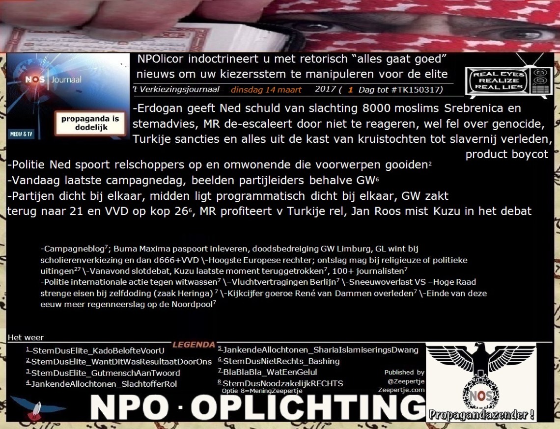 In het rubriekje van de propagandistische campagneblog weer een drietal punten door de N(O)SB voor u uitgelicht. Buma van het CDA wil van alle dubbele paspoorten af, Geert Wilders is met de dood bedreigd in Limburg door bekladding van de studio van tv-Limburg en als laatste de scholierenverkiezing die gewonnen is door GroenLinks gevolgd door d666 en VVD. Verdere categorie 7 blablabla_WatEenGelul items staan onderaan. Opvallend het berichtje over het kunnen ontslaan van een kopvod onder bepaalde omstandigheden. Dit is bepaald door het Europese Hof en wordt zeker even vermeld door de NPOlicor om rechts de wind uit de zeilen te nemen. De overige onderwerpen van deze categorie 7 opvul-itempjes, zijn mogelijk voor sommigen wel interessant maar niet in het kader van politieke indoctrinatie, links-rechts-bashing en framing waar het in deze rubrieken over gaat.