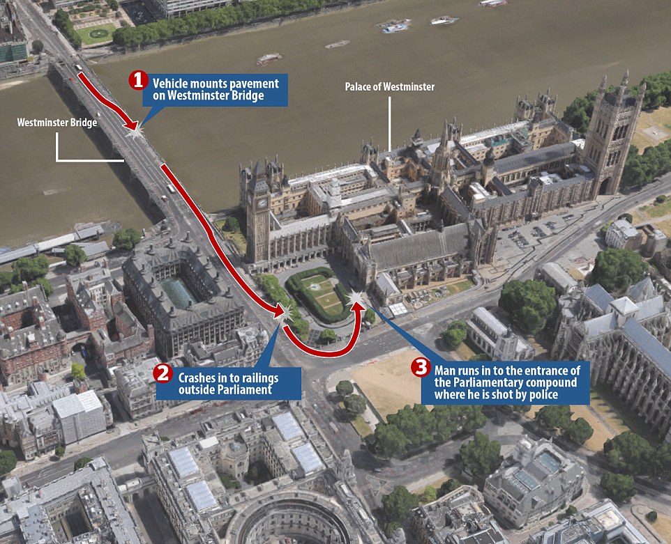 An intruder, described by a witness as ‘middle-aged and Asian’, then managed to break into the grounds of the Houses of Parliament and stabbed a police officer before he was shot.