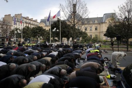 AP, March 31, 2017:PARIS (AP) — Hemmed in and closely watched by police, hundreds of Muslims unrolled rugs and prayed outdoors Friday in the busy streets of a Paris suburb to protest the closure of their prayer hall. The show of strength by throngs of worshippers in Clichy highlighted a long-standing issue for France’s Muslim community, estimated at 5 million people: a shortage of mosques.