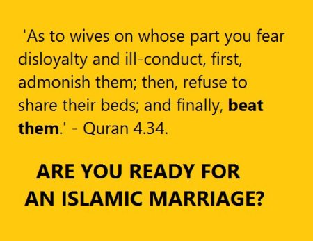 [Chapter 4, Verse 34: “Men are in charge of women by [right of] what Allah has given one over the other and what they spend [for maintenance] from their wealth. So righteous women are devoutly obedient, guarding in [the husband’s] absence what Allah would have them guard. But those [wives] from whom you fear arrogance – [first] advise them; [then if they persist], forsake them in bed; and [finally], strike them. But if they obey you [once more], seek no means against them. Indeed, Allah is ever Exalted and Grand.” (translated by Sahih International)]…