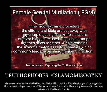 The enemedia always goes out of its way to censor such stories or they scrub Islam from any connection with this misogynistic Islamic practice. Dissemblers and deceivers claim that FGM is a cultural phenomenon, not religious. FGM is an Islamic cultural phenomenon. FGM is found only within and adjacent to Muslim communities (source: Gerry Mackie, “Ending Footbinding and Infibulation: A Convention Account,” American Sociological Review).