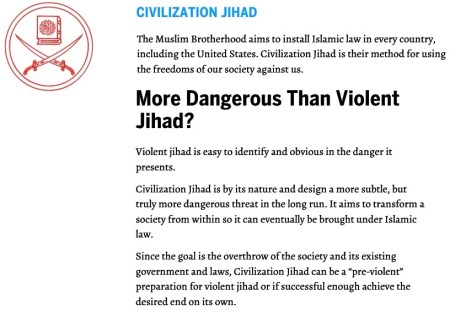 The second theme was that of civilizational Jihad. This is the idea that Islam is silently entrenching itself throughout the government. Frank Gaffney, who served in the Reagan administration and since has begun his own think tank, is known for his conspiracies in which a Muslim Brotherhood is infiltrating the highest echelons of the government.