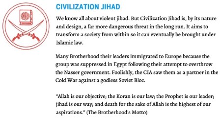 The Muslim Brotherhood is dedicated in its own words, according to a captured internal document, to “a kind of grand Jihad in eliminating and destroying the Western civilization from within and ‘sabotaging’ its miserable house by their hands and the hands of the believers so that it is eliminated and God’s religion is made victorious over all other religions.” That’s from “An Explanatory Memorandum on the General Strategic Goal for the Brotherhood in North America,” by Mohamed Akram, May 19, 1991. Did Frank Gaffney write that? No, he did not.