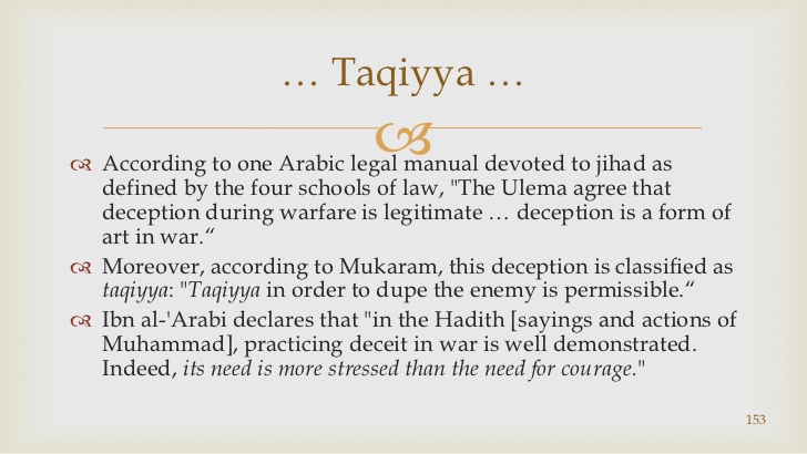 verse, Allah warns believers not to take unbelievers as “friends or helpers” (َأَوْلِيَا — a word that means more than casual friendship, but something more like an alliance), “except when taking precaution against them in prudence” (v. 28). This is a foundation of the idea that believers may legitimately deceive unbelievers when under pressure. The word used for “guard” in the Arabic is tuqātan (تُقَاةً), the verbal noun from taqiyyatan — hence the increasingly familiar term taqiyya. The great Qur’an commentator Ibn Kathir says that the phrase “except when taking precaution against them in prudence” means that “believers who in some areas or times fear for their safety from the disbelievers” may “show friendship to the disbelievers outwardly, but never inwardly. For instance, Al-Bukhari recorded that Abu Ad-Darda’ said, ‘We smile in the face of some people although our hearts curse them.’ Al-Bukhari said that Al-Hasan said, ‘The Tuqyah [taqiyya] is allowed until the Day of Resurrection.’”…