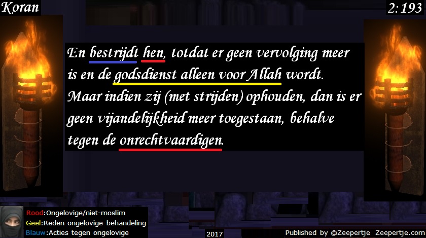 Het strijden (jihad) dient altijd te gebeuren en door te gaan totdat de godsdienst uitsluitend voor Allah is. Dus wanneer u zich bekeert tot de islam en moslim wordt stopt deze strijd pas. Ieder die Allah verwerpt is in strijd met de islam, voert oorlog tegen de islam.