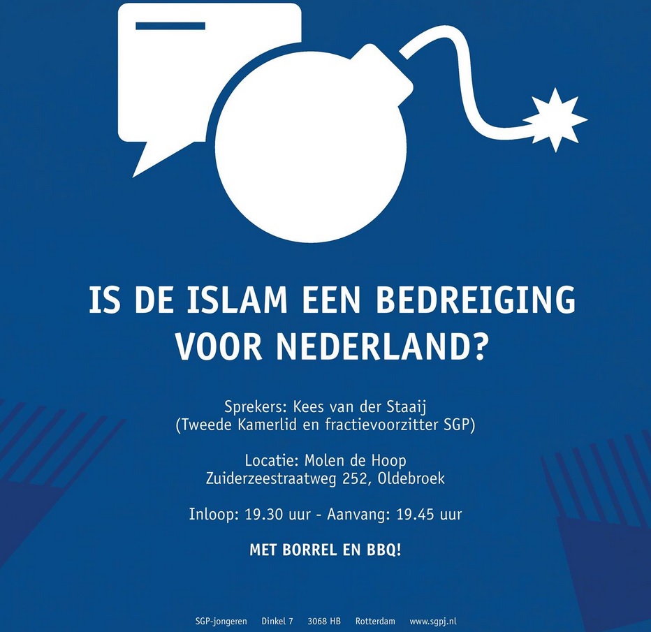 Tot zover niets aan de hand, het standpunt van de SGP over de islam is al lang bekend en de vraag (‘is de islam een bedreiging voor Nederland?’) stellen is niet perse hetzelfde als hem beantwoorden.
