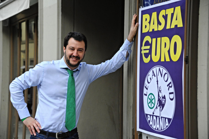 epa04081160 The Federal Secretary of Northern League’s party, Matteo Salvini, poses by a poster during the first stage of the “No Euro tour,” ahead of the upcoming European elections, in Florence, Italy, 16 February 2014. EPA/MAURIZIO DEGL’INNOCENTI