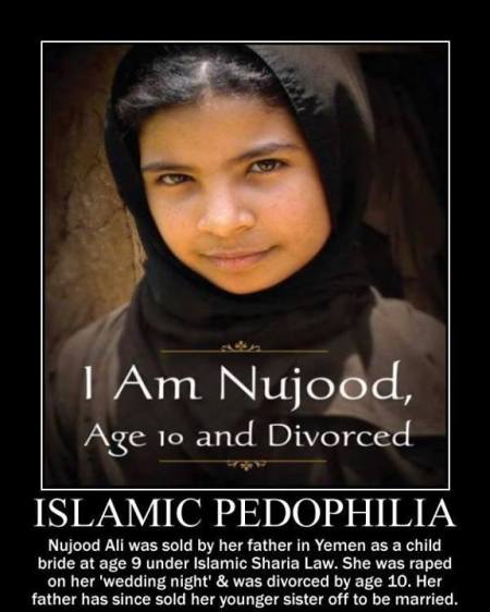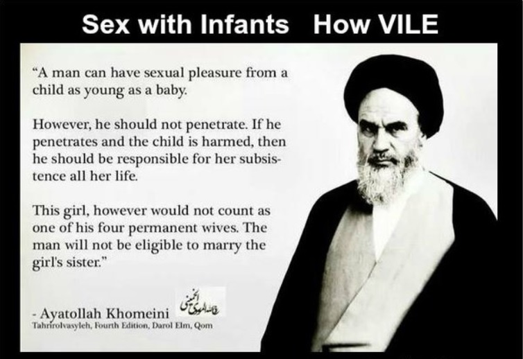 According to Amir Taheri in The Spirit of Allah: Khomeini and the Islamic Revolution (pp. 90-91), Iran’s Ayatollah Khomeini himself married a ten-year-old girl when he was twenty-eight. Khomeini called marriage to a prepubescent girl “a divine blessing,” and advised the faithful to give their own daughters away accordingly: “Do your best to ensure that your daughters do not see their first blood in your house.” When he took power in Iran, he lowered the legal marriageable age of girls to nine, in accord with Muhammad’s example.