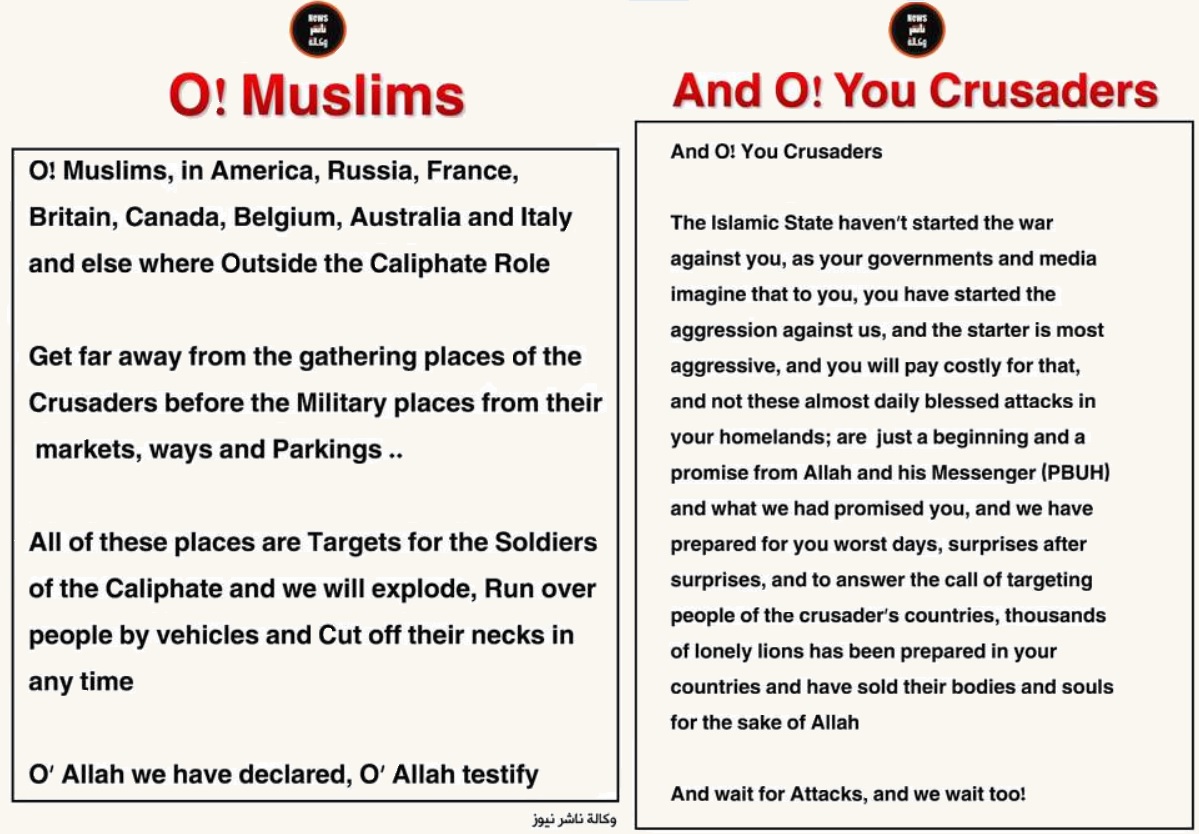 Moslims krijgen er de raad om uit de buurt te blijven van publieke plaatsen zoals “markten, straten en parkings”, omdat “soldaten van het kalifaat zich daar zullen ontploffen, mensen overrijden en hen de keel oversnijden“.