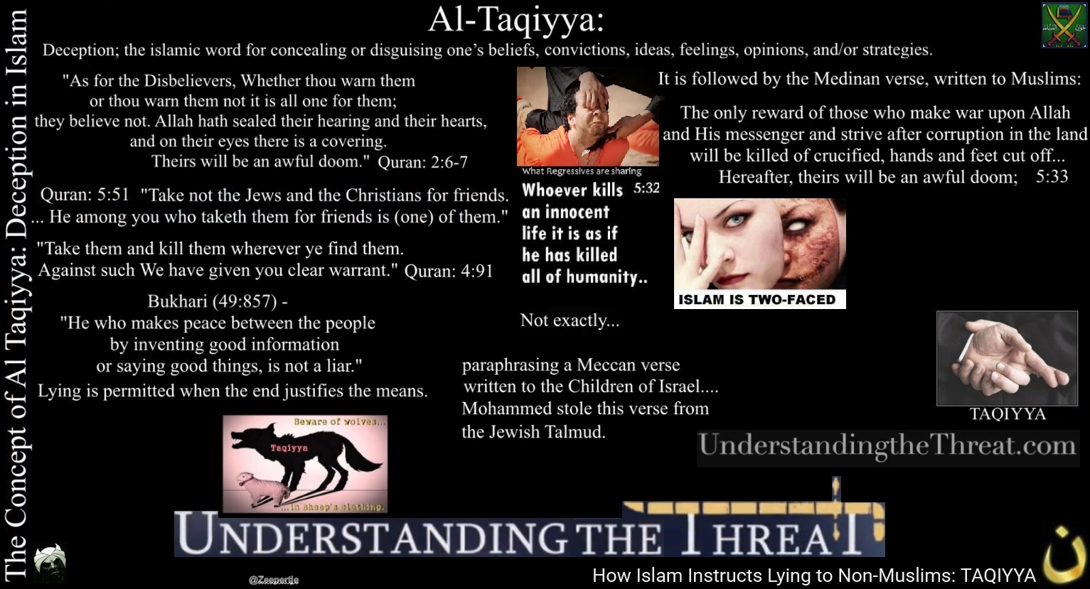 Dus laten we het over imams hebben. Hier wordt het interessant. Imams zijn mensen die veel van hun tijd toewijden aan de islam. Dus zij zijn sterk geneigd om de islam erg serieus te nemen anders zouden ze niet al hun tijd erin investeren. Dus imams weten zeer goed dat de oorlog die gaande is tegen de kafir, iets dat wij terrorisme noemen, deel uitmaakt van de islam. Het maakt deel uit van de jihad en het staat in de boeken, al de moslimleiders weten dat. 1400 jaar islamitische historie weet dat en in de moslimwereld zelf maken imams daar geen geheim van. Maar in landen waar de moslims nog niet in de meerderheid zijn, kunnen ze dat niet toegeven en daarom is daar het islamitische principe genaamd “Taqiyya”. Taqiyya is het misleidend presenteren van de eigen ideologie islam aan de ongelovige. Dus ook al weten de mensen dat de oorlog tegen de kafir een fundamenteel onderdeel van de islam is, zullen zij dat nimmer toegeven aan de kafir zolang deze kafirs in de meerderheid zijn.