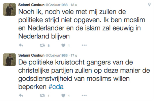 Overigens kwam deze Coskun ook al in opstand medio september 2016, toen nog deel uitmakend van de PvdA door wat tweets over kruistochten de ether in te jagen, alles ter verdediging van de zielige islam natuurlijk. De tweets waren gericht tegen een motie van de CU, CDA en SGP aangaande financiering van moskeeën.