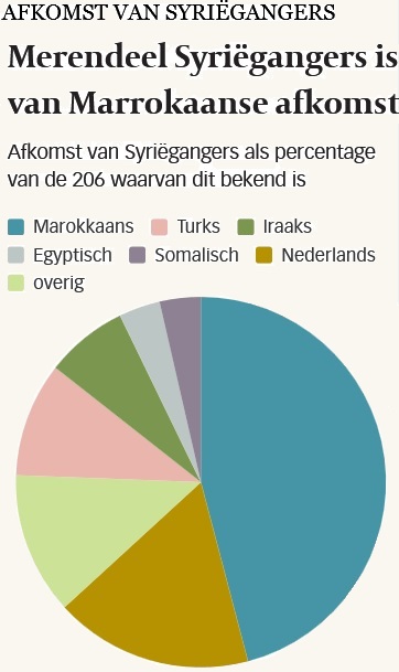 Het grootste deel (45 procent) van de Syriëgangers heeft een Marokkaanse achtergrond. Het Turks-Nederlandse aandeel is met 10 procent veel kleiner.