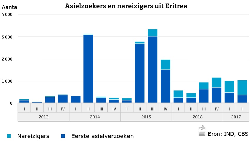Het aantal nareizigers uit Eritrea is de afgelopen 5 kwartalen gegroeid en is in 2017 groter dan het aantal asielzoekers.