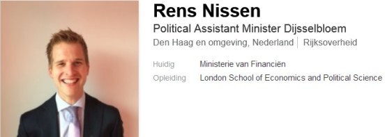 Op volle toeren, een laatste stuiptrekking, geef het een kreet. Hoe dan ook, ’t is ongehoord hoe dit maar doorgaat. Nu heeft Rens Nissen, de persoonlijk assistent en dus rechterhand van minister Dijsselbloem van Financiën weer een prachtig baantje toegeschoven gekregen.