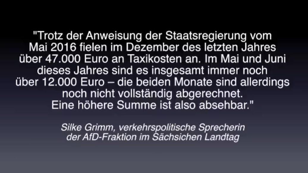 „Trotz der Anweisung der Staatsregierung vom Mai 2016 fielen im Dezember des letzten Jahres über 47.000 Euro an Taxikosten an. Im Mai und Juni dieses Jahres sind es insgesamt immer noch über 12.000 Euro – die beiden Monate sind allerdings noch nicht vollständig abgerechnet. Eine höhere Summe ist also absehbar.