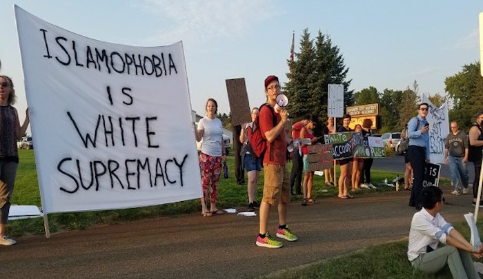 In response to this jihad attack, the righteous Left mounted no protests against Dahir Adan’s mosque.Nor did they make any request that Muslims in the St. Cloud area stop preaching jihad violence. Instead, they protested against the appearance of an Iranian ex-Muslim who was warning against the jihad threat that Dahir Adan embodied. And they protested by holding a large sign reading “Islamophobia is White Supremacy.” So apparently jihad terror is brown and woke. But what about white jihadis, such as John Walker Lindh and Adam Gadahn and a host of others? Is opposing them white supremacy as well? Leftism is getting so complicated these days.