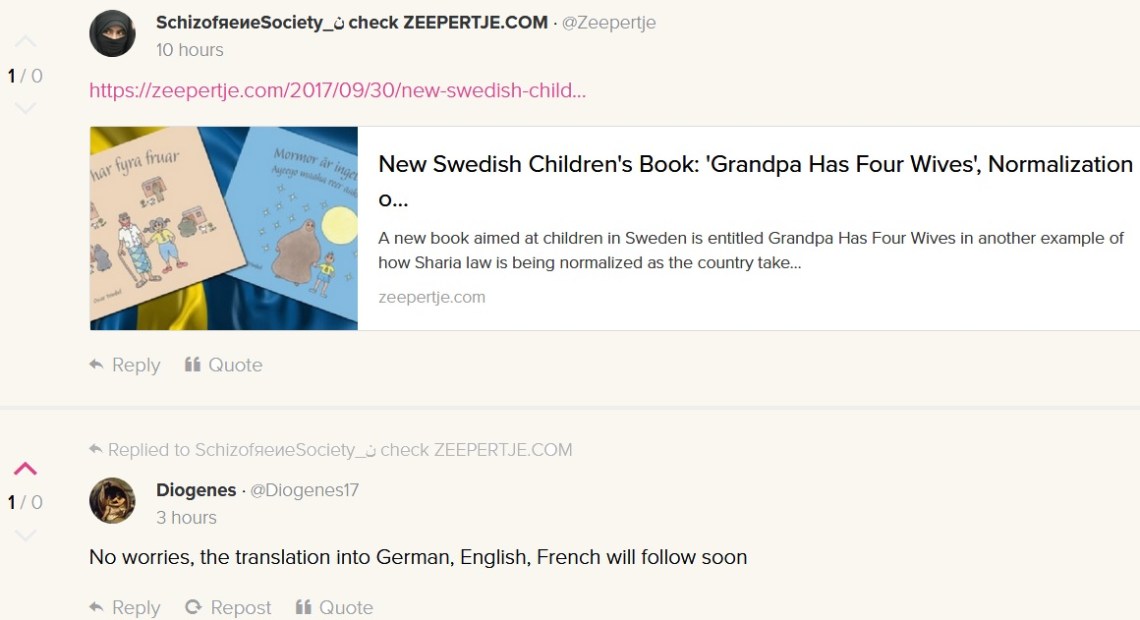 Radicale islam in Jip- en Jånneke-taal in Zweden: een prentenboekje voor de allerkleinsten getiteld Opa heeft vier vrouwen. Polygamie voor Zweedse kløters, welja joh. En in dezelfde serie ook verkrijgbaar: Oma is geen spook. Over de oma van Omar die erbij loopt als een spook gehuld is in een boerka.
