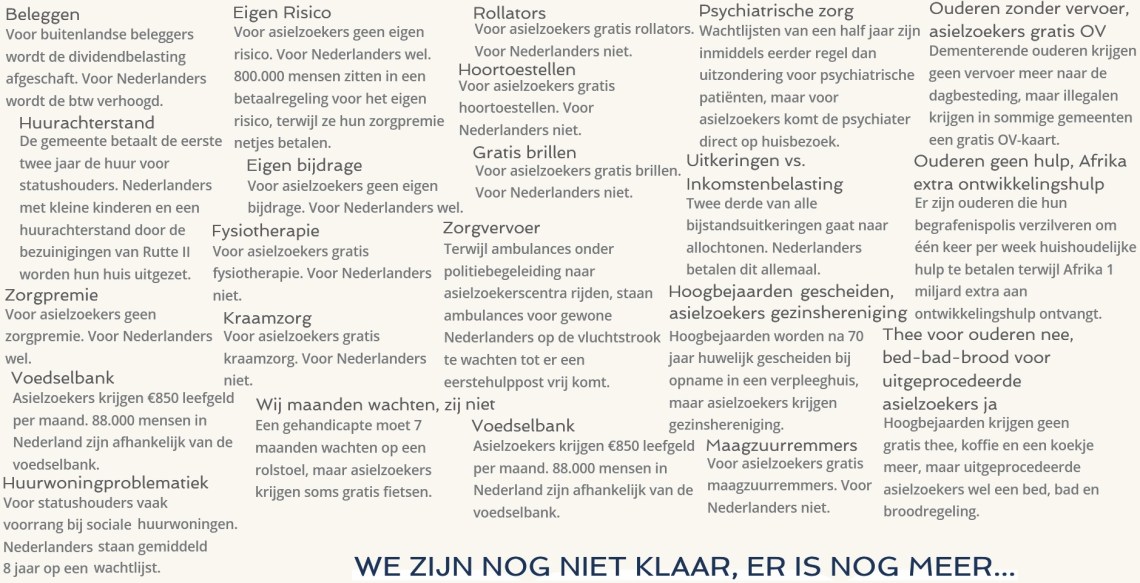 Wilders noemt de verhoging van de btw, het ‘begraven’ van het bindende referendum en de afschaffing van zowel de dividendbelasting en de wet-Hillen. ,,Het ergste is nog dat asielzoekers van alles cadeau wordt gedaan, van woningen tot zorg, van fysiotherapie tot de tandarts. Terwijl voor Nederlanders de kosten alleen maar stijgen. Heel het land zit na de crisis te wachten op lastenverlichting, maar het tegenovergestelde gebeurt. Rutte is gewoon een oplichter.’’