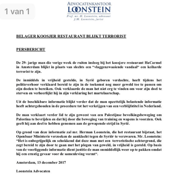 However, to the astonishment of many in the Jewish community, the perpetrator was quickly released. He is likely to get away with a light penalty, because the Dutch Justice Department limited the accusation to “vandalism and theft” only, which will be handled in a low-level procedure. That is quite remarkable, as this attack was against private Jewish property, therefore the Jewish community as such.