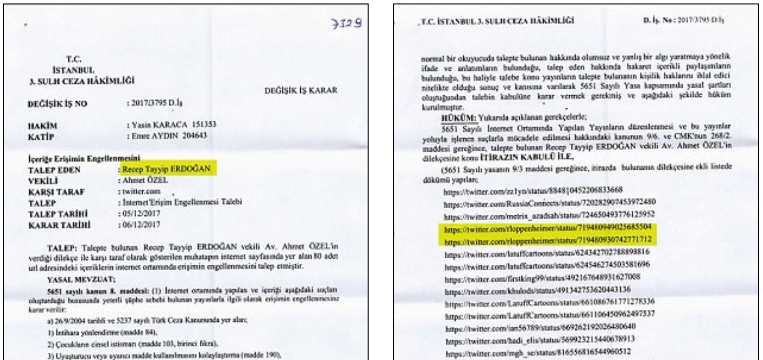 In the Turkish text, Mr Erdogan’s name is shown next to words roughly translated as ‘requesting’ while ‘twitter.com’ is next to words roughly translated as ‘opponent’…