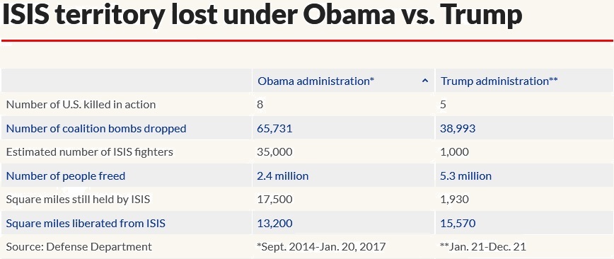 On Jan. 20 — the day Trump was inaugurated — an estimated 35,000 ISIS fighters held approximately 17,500 square miles of territory in both Iraq and Syria.